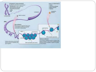 Epigenetics is the study of heritable changes in gene expression that are not caused by changes in DNA sequence. These changes are caused by mechanisms such as DNA methylation and histone modification. Epigenetics can modify gene activation and expression without changing the underlying DNA sequence. Epigenetic modifications like DNA methylation and chromatin remodeling are important in development and cell differentiation, allowing cells to have different functions while containing the same genetic information. Aberrant epigenetic changes are also involved in diseases like cancer, where genes can be inappropriately silenced through hypermethylation or other epigenetic alterations.