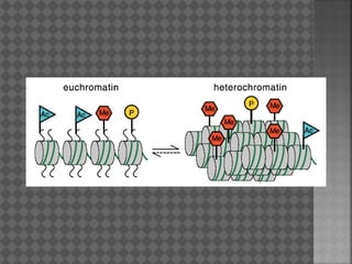 Chromatin organization involves multiple levels of DNA packaging within the cell nucleus. The basic repeating unit is the nucleosome, which consists of 146bp of DNA wrapped around an octamer of histone proteins. Nucleosomes further compact into higher order structures like the 30nm fiber. Chromatin remodeling and epigenetic modifications like DNA methylation, histone acetylation and methylation regulate gene expression by altering chromatin structure and accessibility. These heritable changes in gene expression do not involve alterations to the underlying DNA sequence.