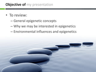 This document provides an overview of epigenetics concepts and environmental influences on epigenetics. It begins with introductory definitions of epigenetics and mechanisms like DNA methylation and histone modifications. It then discusses how the environment can influence the epigenome and provides examples like how air pollution exposure is associated with changes in DNA methylation and blood pressure. It also discusses how parental experiences like odor exposure can influence offspring behavior and neural structure through epigenetic changes in sperm. The document concludes by discussing epigenome-wide study approaches to investigate associations between exposures, epigenetic marks, and disease across the genome.