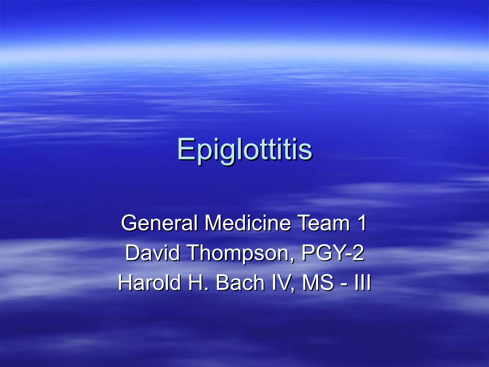 Epiglottitis is a bacterial infection of the epiglottis and surrounding tissues, most commonly caused by Haemophilus influenzae type b. It presents with a sudden onset of sore throat, fever, drooling, and difficulty swallowing in children ages 1-5 years old. On examination, the epiglottis appears red and swollen, often requiring intubation. Treatment involves antibiotics like ceftriaxone to treat the infection along with steroids to reduce swelling and prevent the potential need for tracheostomy. HiB vaccination has greatly reduced the incidence of this disease.