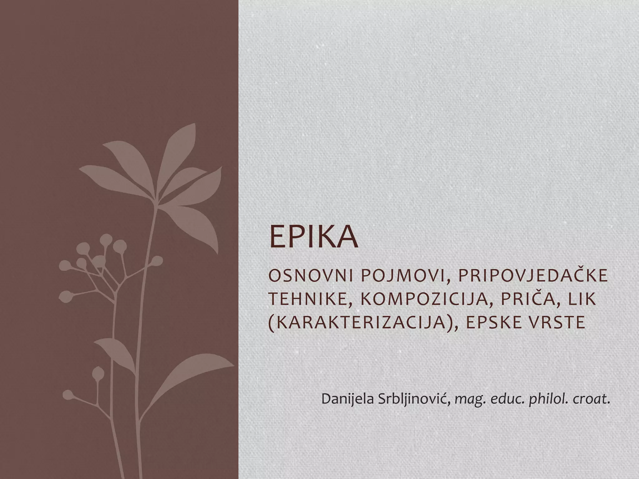 Dokument razmatra osnovne pojmove i pripovjedačke tehnike u epskoj književnosti, uključujući kompoziciju, likove i vrste pripovjedača. Prikazuje različite načine karakterizacije likova, vrste epskih djela, te strukturalne aspekte poput fabule i sižea. Također obuhvaća tehniku pripovijedanja, opisivanja, dijaloga i monologa, te vrste epike u stihu i prozi.