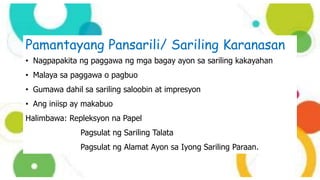 Ang dokumento ay naglalarawan ng pamantayang pansarili at itinakda sa paggawa, na nagpapakita ng kahalagahan ng sariling kakayahan at mga hakbang sa paggawa ng iba't ibang paraan. Ang epiko, isang uri ng panitikan, ay tumatalakay sa kabayanihan at pakikipagsapalaran ng mga tauhan na may katangiang higit sa karaniwan, kadalasang kasama ang mga elemento ng kababalaghan. Ang mga katangian ng epiko ay kinabibilangan ng malikhain at makulay na imahinasyon na naglalarawan ng mga karanasan sa pang-araw-araw na buhay.