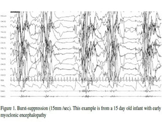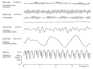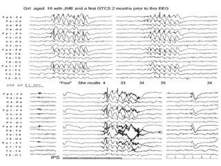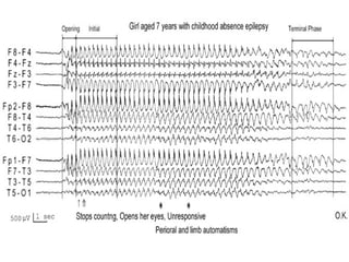 This document discusses different types of brain waves seen on EEGs, including alpha, beta, theta, and delta waves. It then summarizes several common epilepsy syndromes such as benign centrotemporal lobe epilepsy of childhood, juvenile myoclonic epilepsy, autosomal dominant nocturnal frontal lobe epilepsy, Lennox-Gastaut syndrome, childhood absence epilepsy, and others. It provides examples of EEG findings associated with these conditions, such as Rolandic spikes, generalized spike and wave discharges, and hypsarrhythmic patterns.