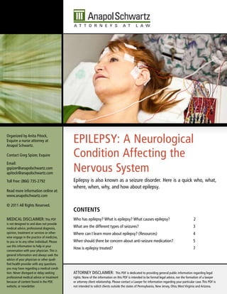 Epilepsy is a neurological condition characterized by recurrent seizures, affecting nearly 3 million Americans, with no clear cause found for about 70% of new cases. The document provides an overview of epilepsy, including types of seizures, treatments options such as medication and surgery, and potential concerns regarding anti-seizure medications, particularly for pregnant women. Resources for further information and support are also listed for individuals seeking to learn more about managing epilepsy.
