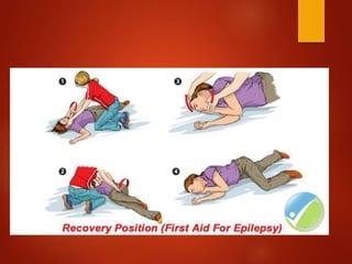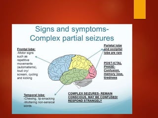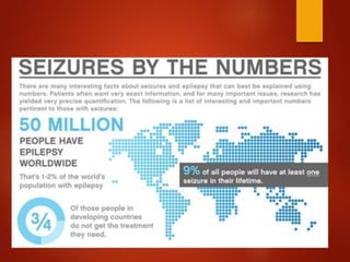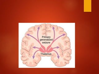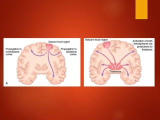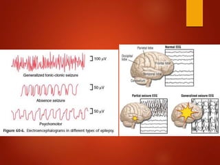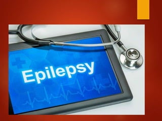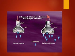 Epilepsy is a chronic condition characterized by recurrent seizures caused by excessive neuronal activity in the brain. Seizures occur when clusters of neurons fire abnormally, driven primarily by glutamate and its NMDA receptor. Some people have genetic mutations affecting the GABA receptor, reducing inhibition of neuronal signals. Seizures can be focal, originating in one brain region, or generalized across both hemispheres. Focal seizures may or may not impair consciousness. Generalized seizures include tonic, clonic, myoclonic, absence and tonic-clonic types. Diagnosis involves tests like MRI, CT and EEG to identify potential causes. Treatment options include anticonvulsant drugs, epilepsy surgery, nerve stimulation, and