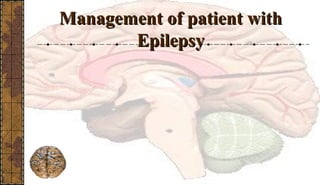 This document provides information on the management of patients with epilepsy. It defines epilepsy and seizures, discusses the difference between seizures and epilepsy, and covers the historical background and classifications of seizures. It also discusses the causes, pathophysiology, clinical manifestations, diagnosis and management of epilepsy. Management involves treatment of acute seizures, removal of precipitating factors, long-term antiepileptic drug therapy, and other options like surgery or diet. The goal of management is to control seizures and prevent complications through appropriate treatment.
