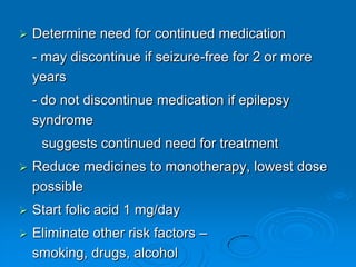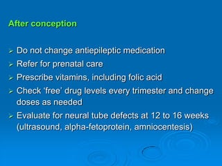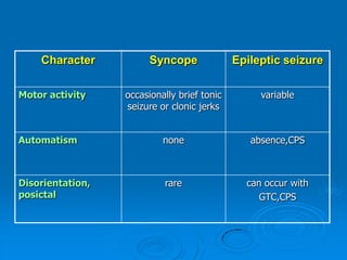 Seizures and epilepsy are defined. Seizures are caused by sudden surges of electrical activity in the brain that affect how a person feels or acts for a short time. Epilepsy is a condition involving the central nervous system that requires a person to have had at least two seizures not caused by a known medical condition. Diagnosing seizures involves considering witness accounts, symptoms, and test results like EEGs and neuroimaging. Treatment involves identifying seizure types and potentially using anti-seizure medications or surgery to control seizures.