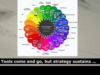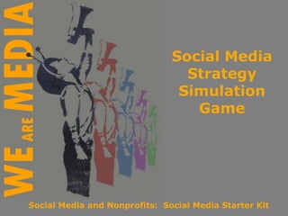 This document outlines an agenda for a workshop on developing social media strategies. It includes an icebreaker, introduction of the strategy game, breaking into groups to play the game, and report outs. The game involves identifying audiences, reviewing strategy approaches, selecting tools within a limited point system, revising for real-life challenges, and reporting out strategies. The objectives are to experience a strategy brainstorm, select appropriate tools, and identify experiments. Key lessons from case studies on non-profits that emphasize listening, community building and storytelling are provided.