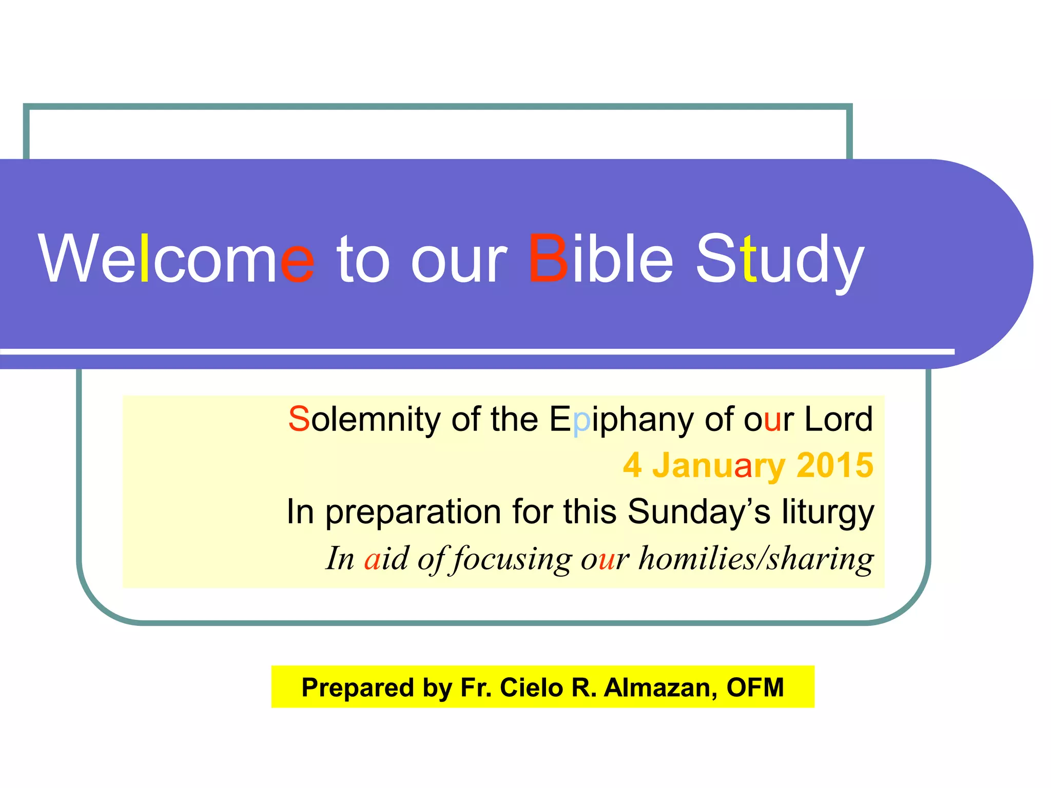 The document is a preparation for a Bible study on the Solemnity of the Epiphany, focusing on readings from Isaiah, Ephesians, and Matthew. It highlights themes of light, God's glory, and the universal call to salvation, emphasizing the joy and importance of recognizing Jesus as the light that guides all nations. Various reflections encourage a response to the light and the recognition of Jesus as the fulfillment of prophecies by the Magi.