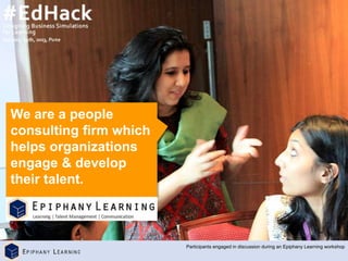 Epiphany Learning is a consulting firm focused on enhancing talent engagement and development in organizations through various services including training needs analysis, e-learning solutions, and talent management. Their instructional design framework, OIRE, aims to create engaging learning experiences, supported by interactive classroom games and storytelling workshops for leadership. The firm emphasizes understanding employee journeys and using innovative communication strategies to improve engagement and commitment.
