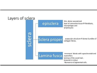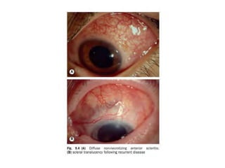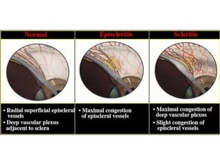 This document discusses episcleritis and scleritis. Episcleritis involves inflammation of the episclera and is typically benign and self-limiting. Scleritis involves inflammation of the sclera and can be more serious, potentially causing vision loss if untreated. Scleritis is classified as anterior (non-necrotizing or necrotizing) or posterior. Treatment involves topical steroids and NSAIDs for mild cases and systemic steroids and immunosuppressants for more severe or necrotizing forms. Both conditions require treatment of any underlying systemic diseases.