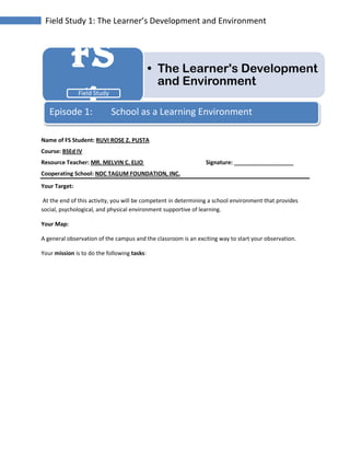 1. The student visited NDC Tagum Foundation school to observe the learning environment. The campus was found to be wide with green surroundings and mostly clean buildings.