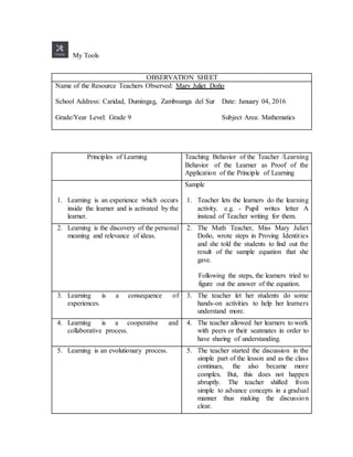The document outlines principles of learning that were observed being applied in a Grade 9 mathematics classroom. It summarizes the teacher's adherence to 9 principles of learning through her teaching behaviors and the learning behaviors of her students. These include allowing students to actively participate in learning, discovering personal meaning, using hands-on activities, collaborative work, gradual instruction from simple to complex concepts, and addressing varied learning styles. The observer agreed that the teacher generally applied the principles well, though some were less evident. Overall, observing the classroom application of learning principles provided lessons about creating an organized, orderly lesson to achieve goals and maximize student learning.