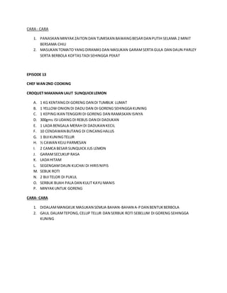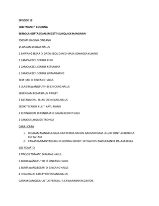 This document provides recipes for two dishes - Berbola Koftas Dan Spegetti Sunquick Mandarin and Croquet Makanan Laut Sunquick Lemon.