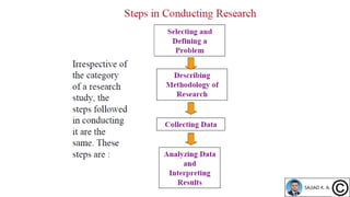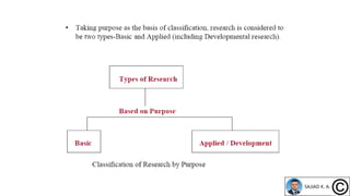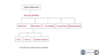 The document provides an overview of research methodologies, emphasizing the significance of classification and various types of research, including basic, applied, descriptive, and correlational research. It outlines the steps involved in conducting research, from problem selection to data collection, analysis, and reporting. Key examples illustrate the application of different research methods in understanding social phenomena and scientific inquiries.