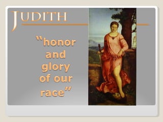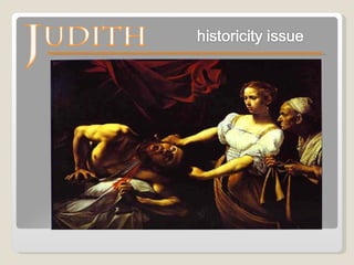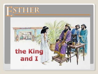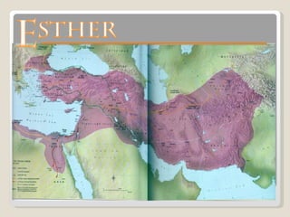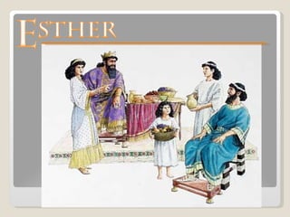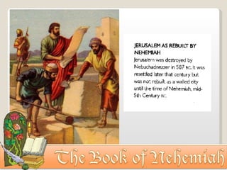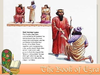 The document discusses the Jewish festival of Purim, commemorating the deliverance of Jews in the Persian Empire, characterized by merriment, costumes, and community festivities. It also touches on the historical and literary significance of various biblical books, including Judith, Tobit, and Chronicles, emphasizing themes of faith and divine providence in difficult times. The chronicler's works reflect a shift from political greatness to a focus on religious identity and the importance of the law in the restored community.