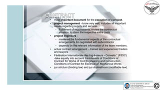 The document discusses project management contracts, emphasizing their crucial role in project execution and the various parties involved, including the employer, engineer, and contractor. It highlights the importance of clear contractual terms to prevent disputes and outlines the responsibilities of project engineers, contractors, and employers in managing these contracts effectively. Additionally, it addresses legal considerations and requirements for communication and documentation throughout the project lifecycle.