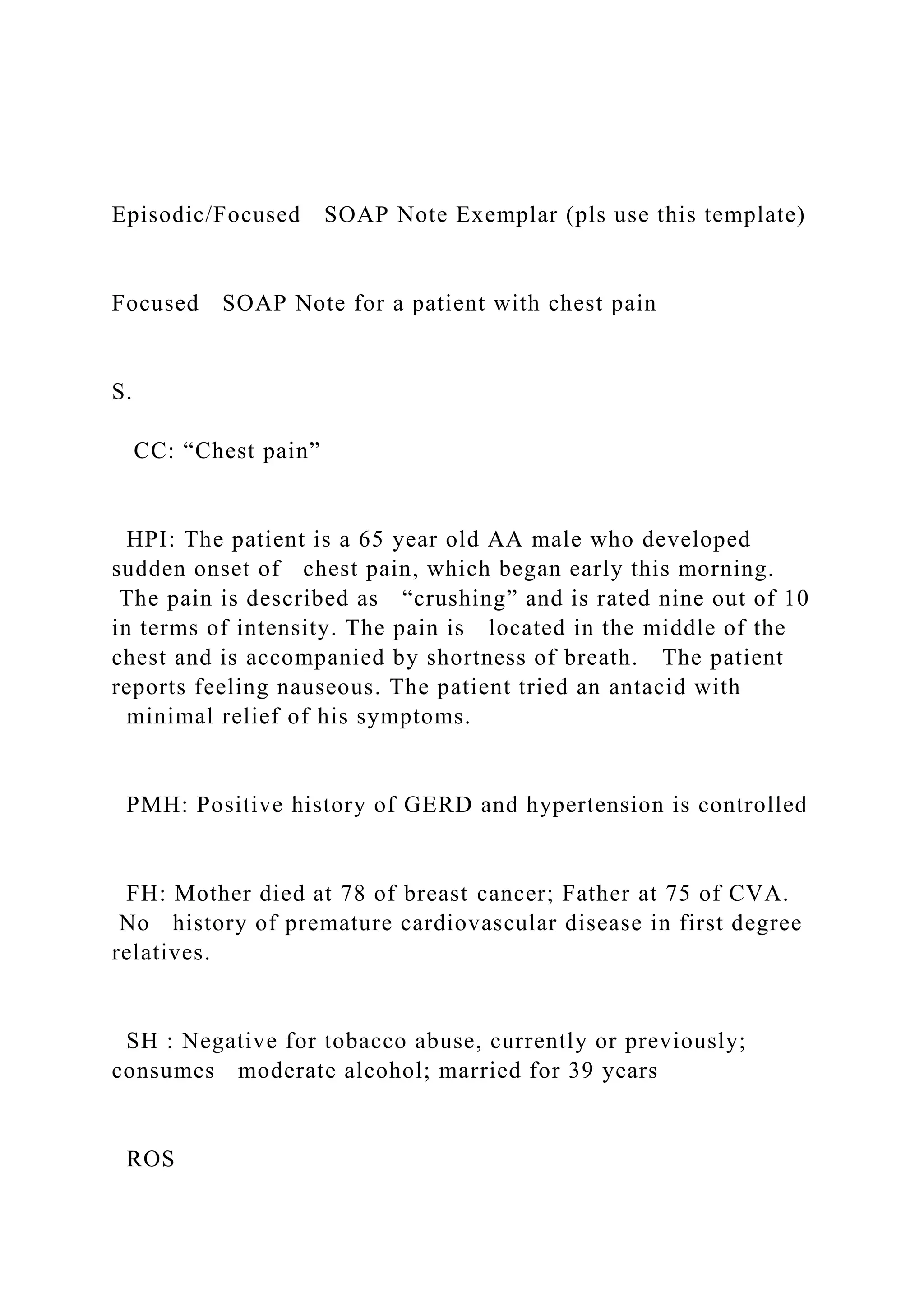 The document presents a focused SOAP note for a 65-year-old male patient experiencing sudden, severe chest pain and shortness of breath, with a primary diagnosis of myocardial infarction supported by a differential diagnosis. It also outlines an assignment for assessing neurological symptoms using a similar episodic/focused SOAP note format for a separate case of a female patient with wrist pain and sensory symptoms. The notes provide guidance on documentation and diagnostic evidence for both cardiovascular and neurological assessments.