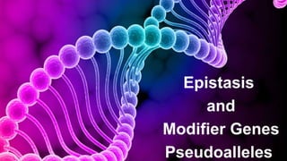 Epistasis occurs when one gene suppresses or masks the expression of another gene. There are different types of epistasis including dominant, recessive, duplicate dominant, and duplicate recessive epistasis. Epistasis ratios in offspring depend on the type of epistasis and can be 12:3:1, 9:3:4, 15:1, or 9:7. Modifier genes modify the effects or expression of another gene without masking it, like genes influencing coat color in mice. Pseudoalleles are two closely linked genes affecting the same trait that can undergo recombination like different eye color mutants in Drosophila.