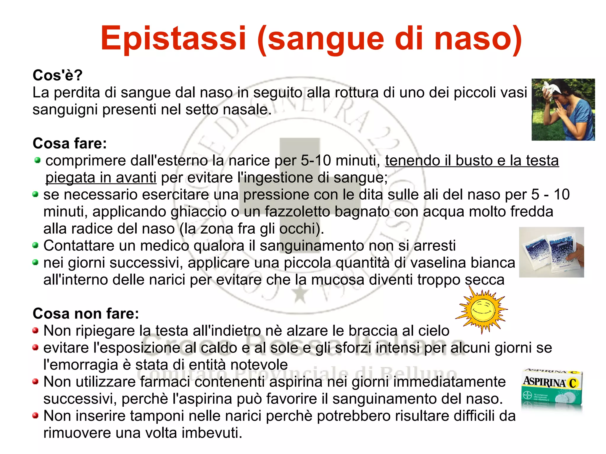 L'epistassi è la perdita di sangue dal naso causata dalla rottura di vasi sanguigni nel setto nasale. Si consiglia di comprimere la narice e mantenere la testa piegata in avanti per fermare il sanguinamento, evitando errori come piegare la testa all'indietro o usare aspirina. Se il sanguinamento persiste, è opportuno contattare un medico e applicare vaselina per prevenire la secchezza mucosa.