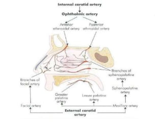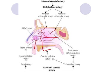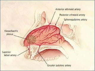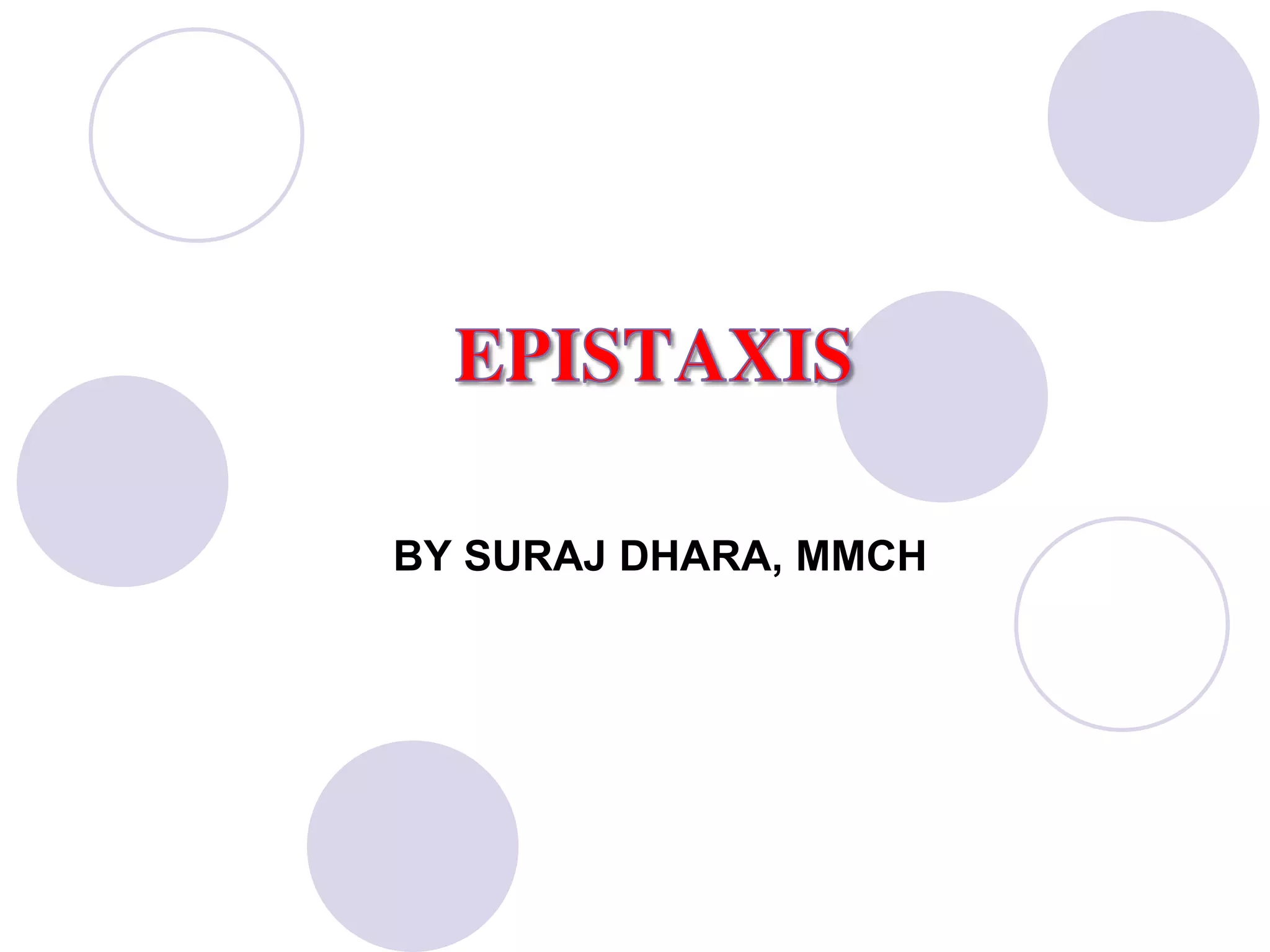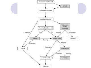 This document discusses epistaxis (nosebleeds), including its causes, sites of bleeding, classification, and management approaches. The main points covered are: