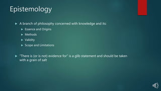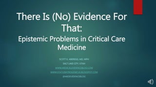 This document discusses several epistemic problems in critical care medicine related to evidence and knowledge. It outlines how the statement "there is evidence for" can obscure a more complex reality. Trials can produce false positives or negatives, and high prior probabilities of the null hypothesis combined with an alpha of 0.05 can lead to many false positive findings. It also discusses how problems like inadequate power from underestimated sample sizes and overestimated treatment effects can undermine trials and produce false negatives. Overall, the document advocates for more rigorous and nuanced interpretations of evidence that consider factors like prior probabilities, replication rates, and the limitations of statistical methods and trial designs.