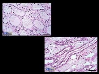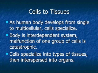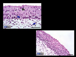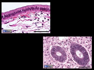 There are four main types of tissues in the human body: epithelial, connective, muscle, and nervous tissue. Epithelial tissue forms protective coverings and linings throughout the body, including the skin, digestive tract, and respiratory tract. It has several key characteristics, such as being avascular and forming sheets of cells. Epithelial tissue is classified based on cell shape and number of cell layers into simple and stratified types, including squamous, cuboidal, columnar, pseudostratified, and transitional epithelium. Glands are specialized clusters of epithelial cells that secrete substances like hormones, acids, and oils.