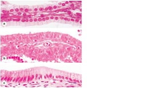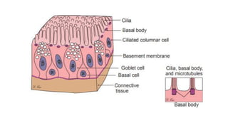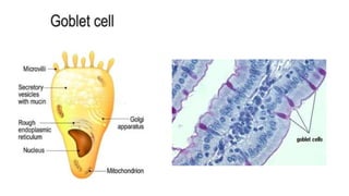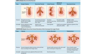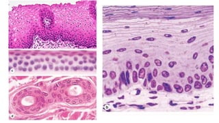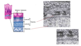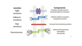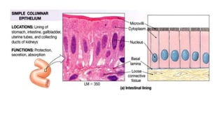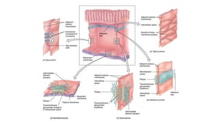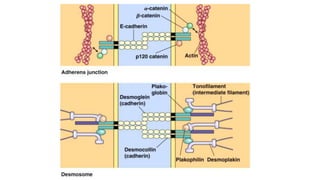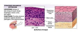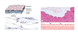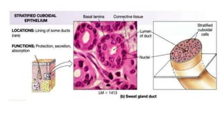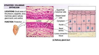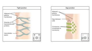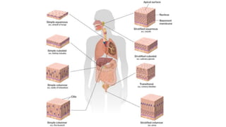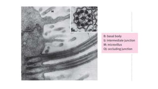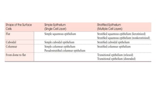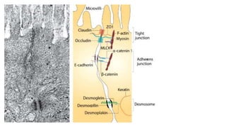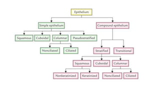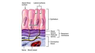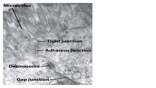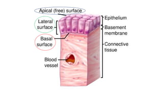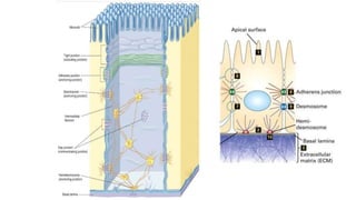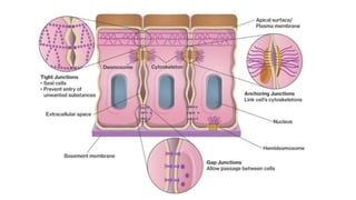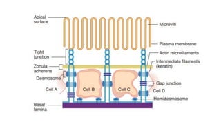 Epithelial tissue is one of the four fundamental tissues in the human body, forming protective cellular layers that line external and internal surfaces, allowing for functions such as protection, secretion, absorption, and sensation. This document details the classification, structure, and functions of epithelial tissue, highlighting aspects such as intercellular junctions, the basement membrane, and specialized cell surfaces, including microvilli and cilia. Additionally, it discusses the medical significance of epithelial junctions and diseases related to their dysfunction.