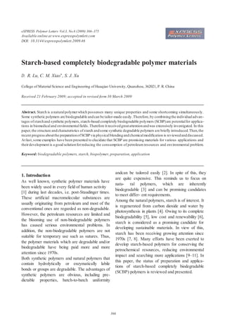 Starch is a natural polymer that is renewable and biodegradable. However, it has poor processability and mechanical properties on its own. This document discusses how starch can be combined with synthetic biodegradable polymers like polylactide (PLA) and polycaprolactone (PCL) to create completely biodegradable polymer materials with improved properties. The polymers are blended physically or chemically modified starch is combined. These starch-based completely biodegradable polymers (SCBP) have potential applications in biomedical and environmental fields due to their low cost, biodegradability and ability to reduce consumption of petroleum resources.