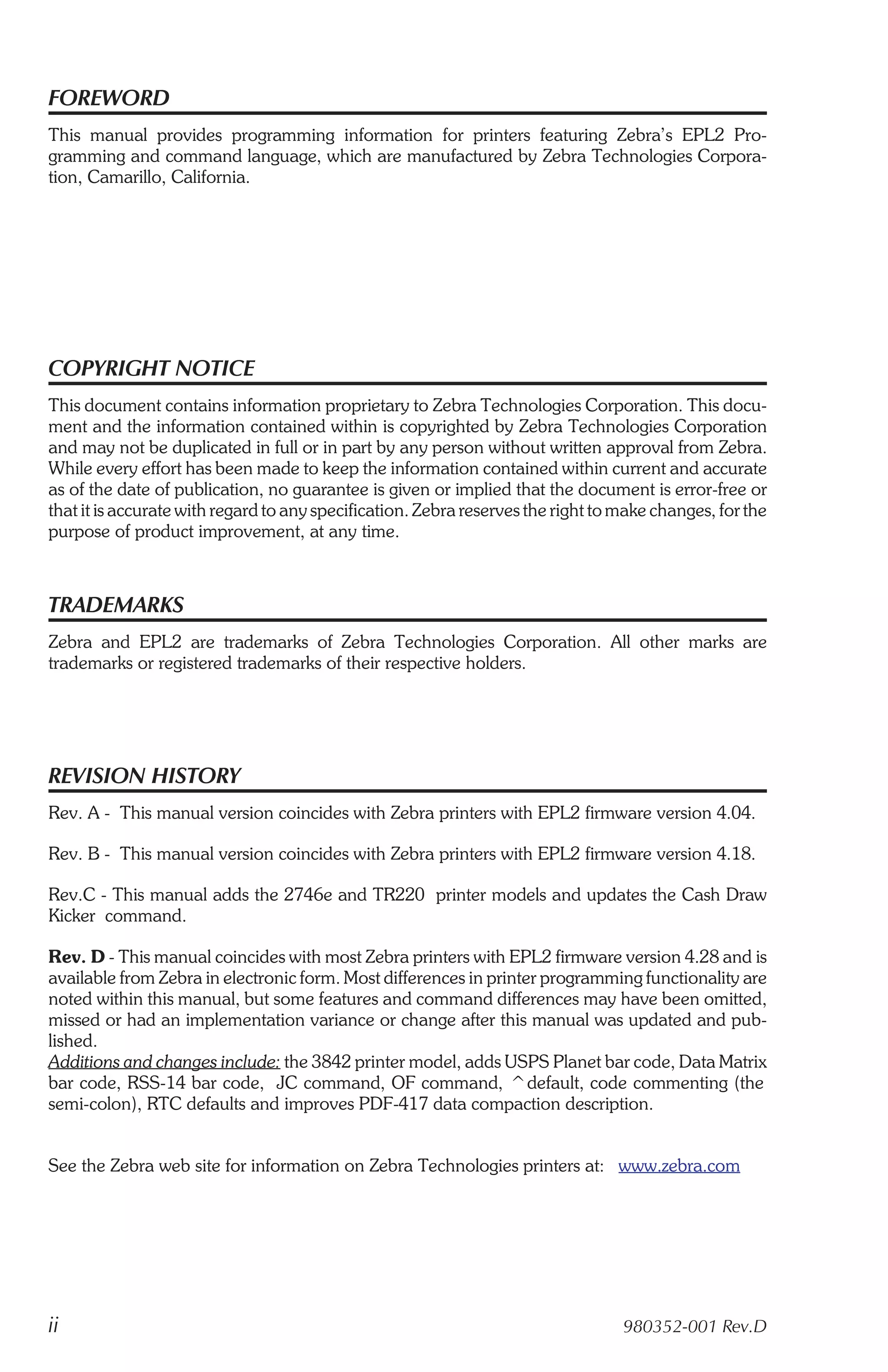 This document provides a programmer's manual for printers using Zebra's EPL2 programming language. It includes sections on printer configuration, command reference which describes each EPL2 command and its usage, and appendices with additional reference information like character sets and cash drawer kicker usage. The manual is intended to help programmers understand how to use EPL2 commands to control printer functions and format print output.