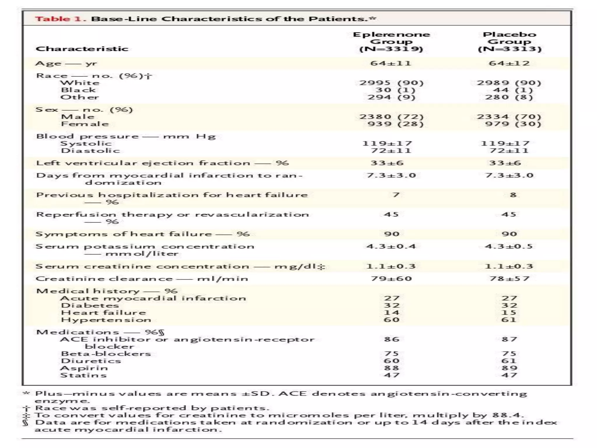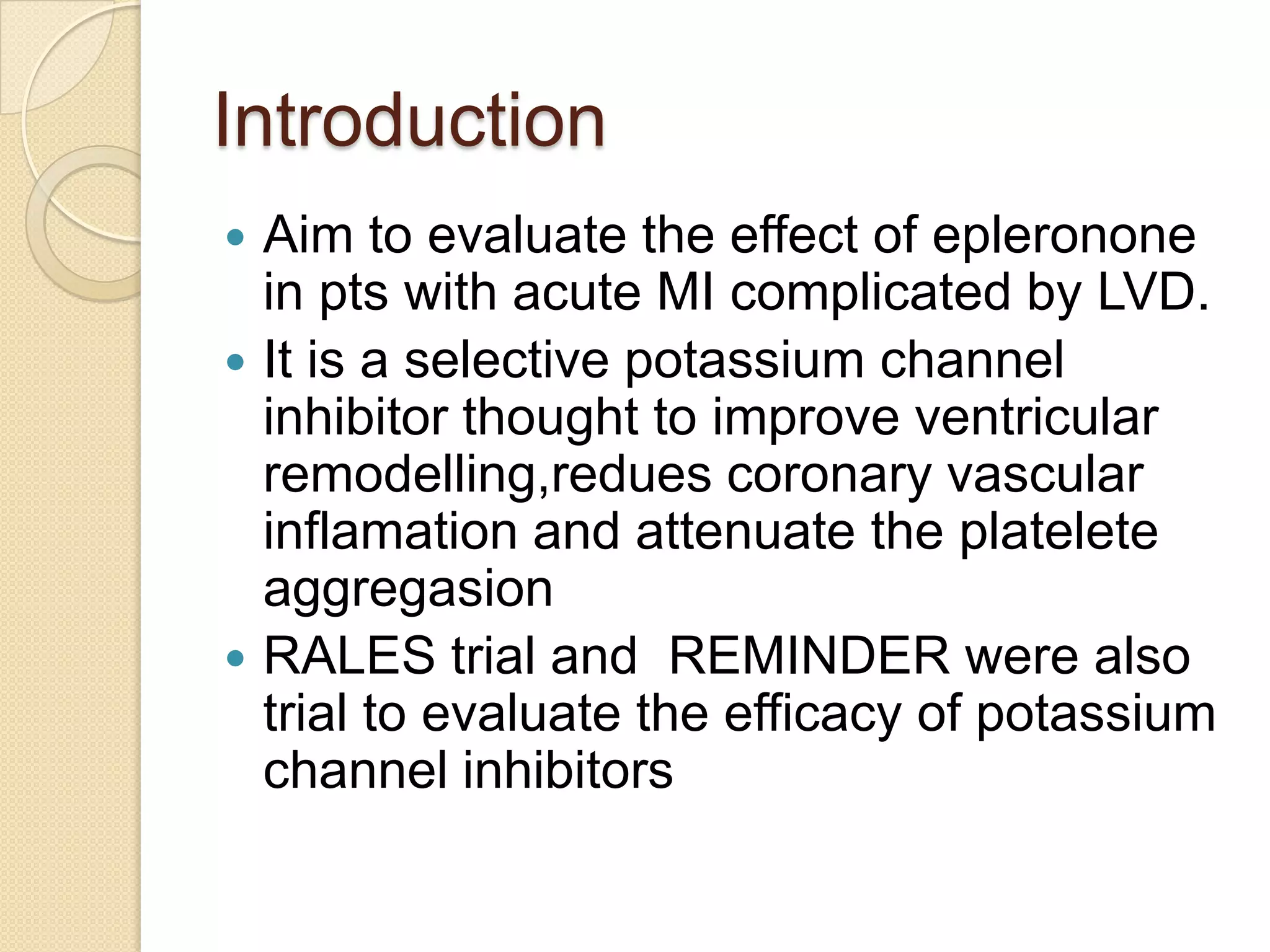 This document summarizes a clinical trial that evaluated the effect of the selective aldosterone blocker eplerenone in patients with left ventricular dysfunction after myocardial infarction. The trial involved over 6,600 patients who received either eplerenone or a placebo in addition to optimal medical therapy. The results showed that eplerenone reduced all-cause mortality by 14.4% compared to 16.7% for placebo and reduced cardiovascular mortality and hospitalization. However, there was an increased risk of serious hyperkalemia with eplerenone. The study concluded that eplerenone improves outcomes for patients with left ventricular dysfunction after a myocardial infarction when added to maximal medical therapy.