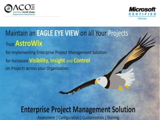 AstroWix Consulting Services provides strategies and models for business transformation through services like enterprise maturity assessments, project portfolio management, process and methodology consulting, project management office setup and support, enterprise project management rollouts, project audits, and project management consultancy. AstroWix helps clients create and execute strategies from conceptualization through implementation.