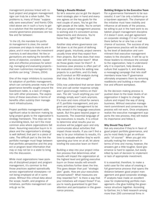 The document discusses the importance of integrating project management and governance to optimize project investments and align them with organizational goals in a competitive environment. It emphasizes that effective governance frameworks need executive buy-in and clear communication between all levels of the organization to successfully manage portfolios and achieve better outcomes. By implementing structured governance and portfolio management processes, organizations can reduce project redundancy and improve decision-making, ultimately enhancing profitability and performance.