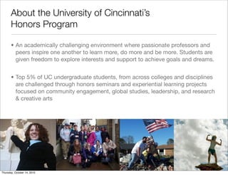 This document discusses e-portfolios, including their purpose as a collection of student work showing progress and achievement. E-portfolios can impact the learning process by encouraging reflection and collaboration, and impact learning outcomes by supporting curriculum goals and allowing experimentation. When integrated across disciplines and between academic and professional work, e-portfolios can foster integrative learning. The document also examines issues around e-portfolio assessment, functionality, and systems challenges in universities.