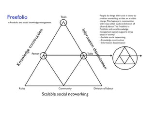 The document discusses the purpose and development of e-portfolios in education, emphasizing their role in adapting to changing learning demands and pedagogic approaches. It highlights the importance of reflection in the learning process, the challenges of ownership and access to e-portfolios, and the need for effective representation of informal learning. Additionally, it suggests that e-portfolios are particularly effective in project-based learning and assessments that promote deeper reflection.