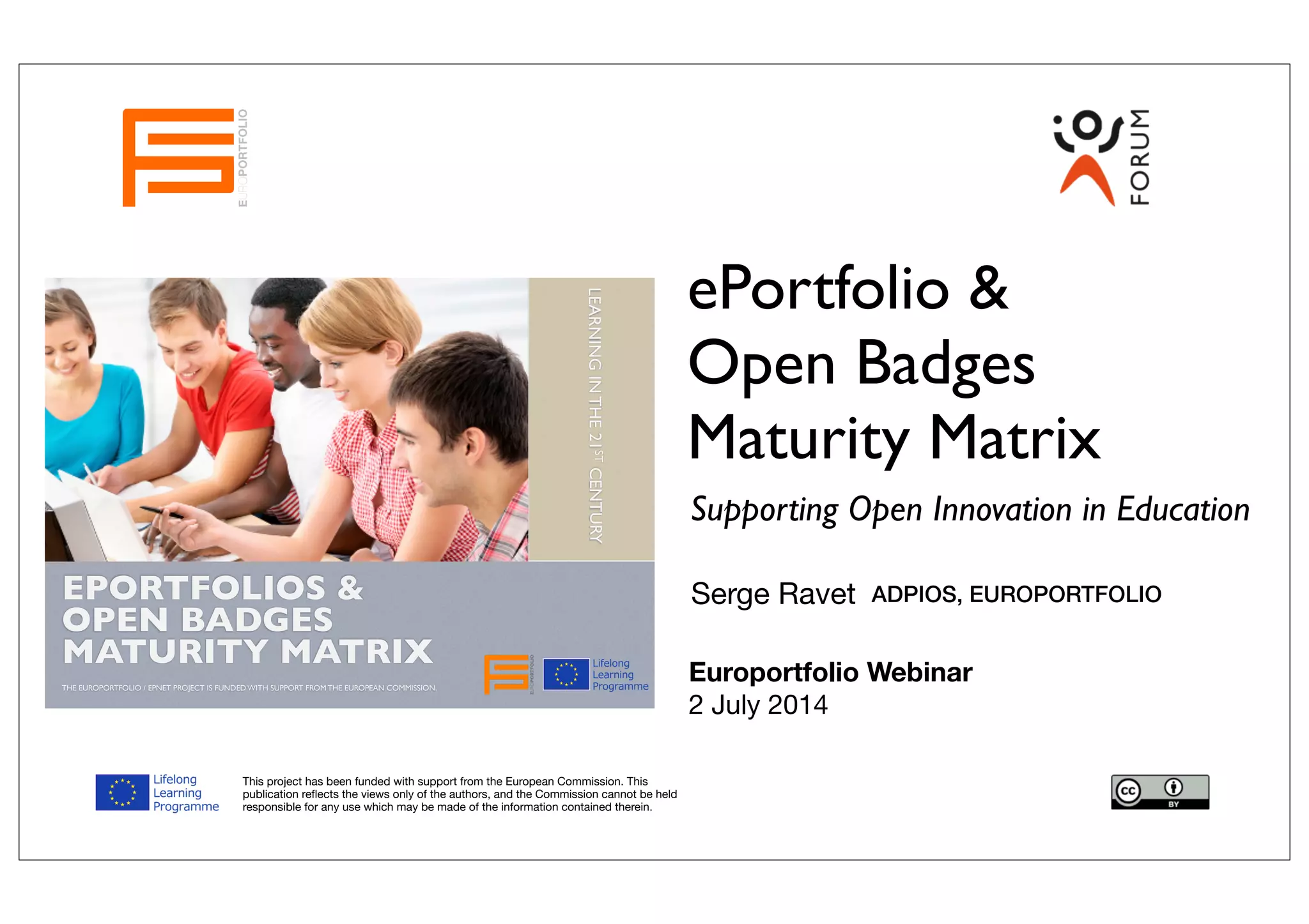 The evaluation report presents the ePortfolio and open badges maturity matrix developed under the Europortfolio/EPNet project, funded by the European Commission. It discusses the varying maturity levels of ePortfolio practices in contexts such as learning, assessment, and technology integration across formal and informal settings. The report highlights important aspects like curriculum design, reflective practices, assessment methods, and ICT skills among teaching staff and learners, detailing the progress from initial awareness to advanced implementation stages.