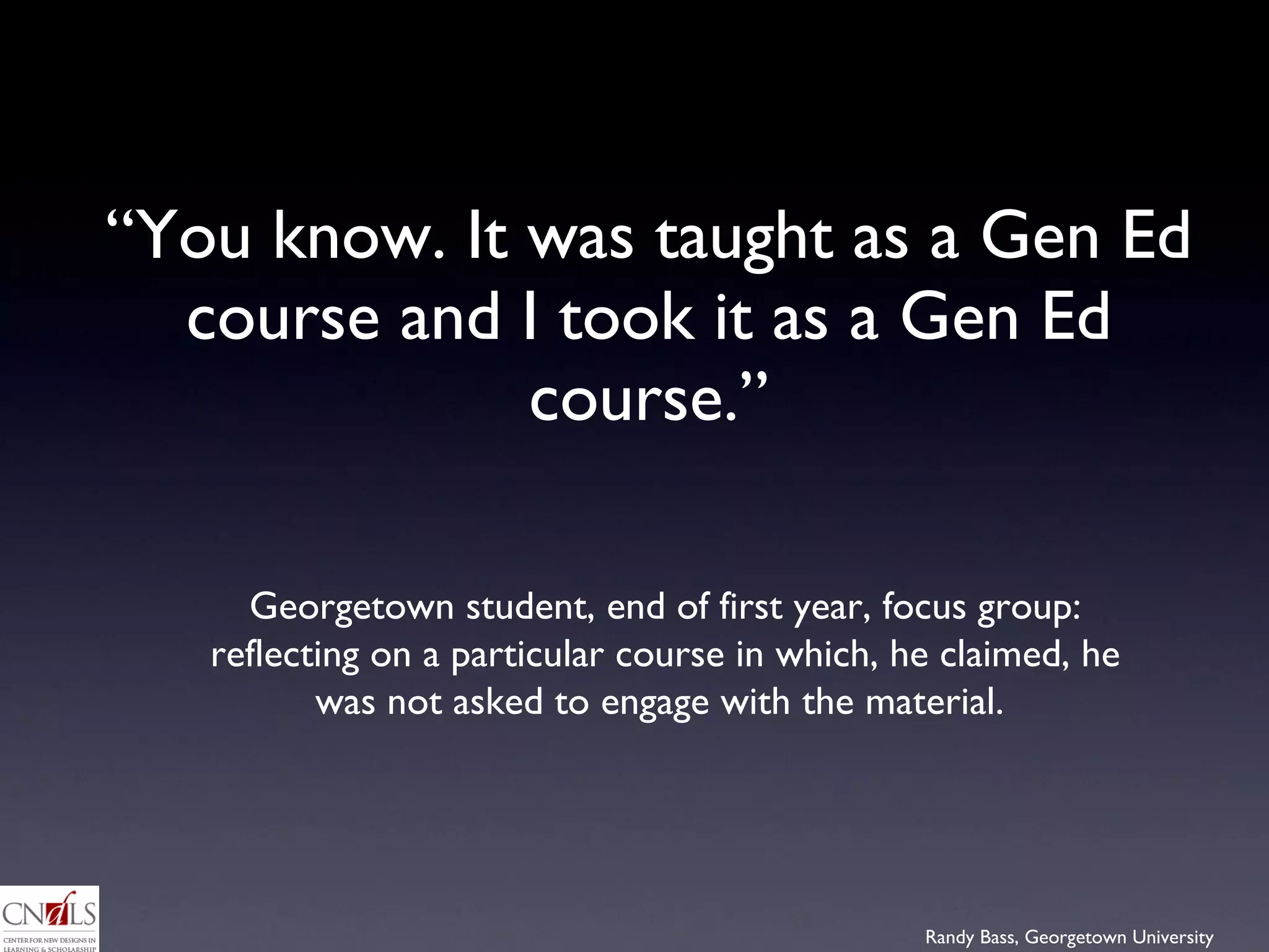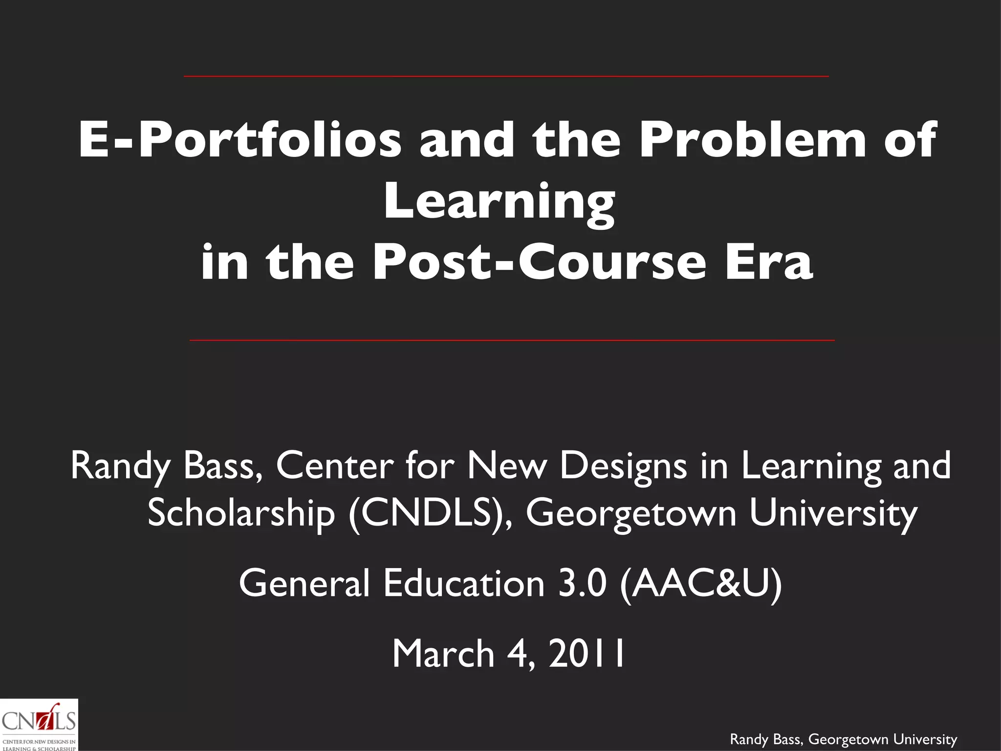 The document discusses the evolution of learning in the post-course era, questioning the relevance of traditional curricula in fostering meaningful educational experiences. It emphasizes the importance of high-impact practices, such as collaborative learning and reflective e-portfolios, as tools for integrating learning across various contexts. The piece highlights the need for curricula to adapt and prioritize experiential and participatory learning opportunities to better support student development.