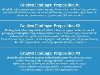 Dr. Marc Zaldivar's presentation discusses the significance of eportfolios as tools for enhancing student learning and engagement through various educational phases. It emphasizes how eportfolio pedagogy supports students in connecting their learning experiences, fostering self-understanding, and taking responsibility for their education. The document highlights practical applications and benefits of eportfolios in demonstrating competencies and improving curriculum assessments.