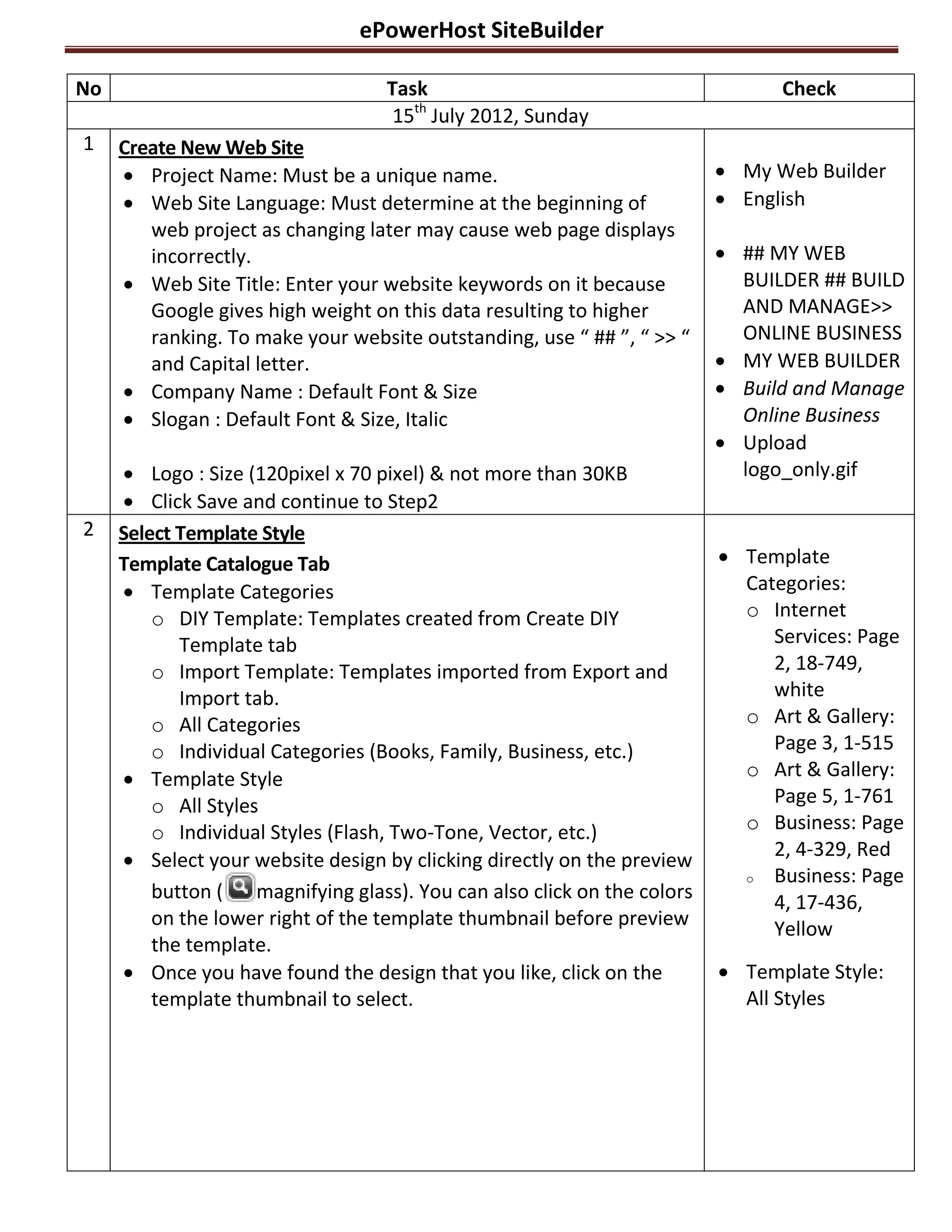 The document provides step-by-step instructions for using ePowerHost SiteBuilder to create a new website. It outlines the 7 key steps: 1) Create New Web Site, 2) Select Template Style, 3) Select Your Web Site Style, 4) Page Structure, 5) Site Content, 6) Extras, and 7) Publish. The instructions describe the options and settings available at each step to design all aspects of the new website before publishing it online.
