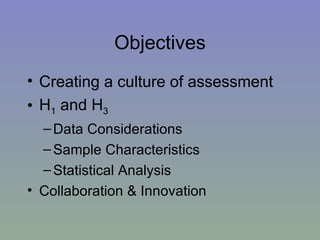 The document outlines a mixed-model approach to assessment in academic libraries, emphasizing the need to create a culture of assessment to enhance service quality and meet customer expectations. It discusses statistical analysis methods used to evaluate library service quality, including the impact of reporting structures and the number of constituents served on satisfaction ratings. The findings from various surveys, including LibQUAL+, are used to support the hypotheses related to quality of service and institutional characteristics.