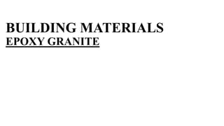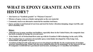 Epoxy granite is a composite material made of epoxy resin and granite aggregates. It was developed in the 1970s as an alternative material for machine tool bases to provide better vibration damping, longer tool life, and lower assembly costs compared to cast iron and steel. The manufacturing process involves mixing granite aggregates with epoxy resin at room temperature to form a precision casting. Epoxy granite is commonly used as machine tool bases and industrial slabs due to its vibration damping properties, design flexibility, chemical resistance, and energy efficiency compared to metal casting.