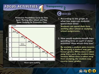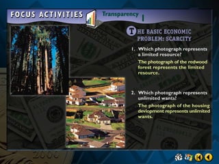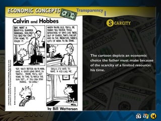 This document provides an overview of Chapter 1 from an economics textbook. It introduces key concepts such as scarcity, factors of production, and the three basic economic questions that every society must address regarding what, how, and for whom to produce. It also summarizes the four key elements of economics: description, analysis, explanation, and prediction.