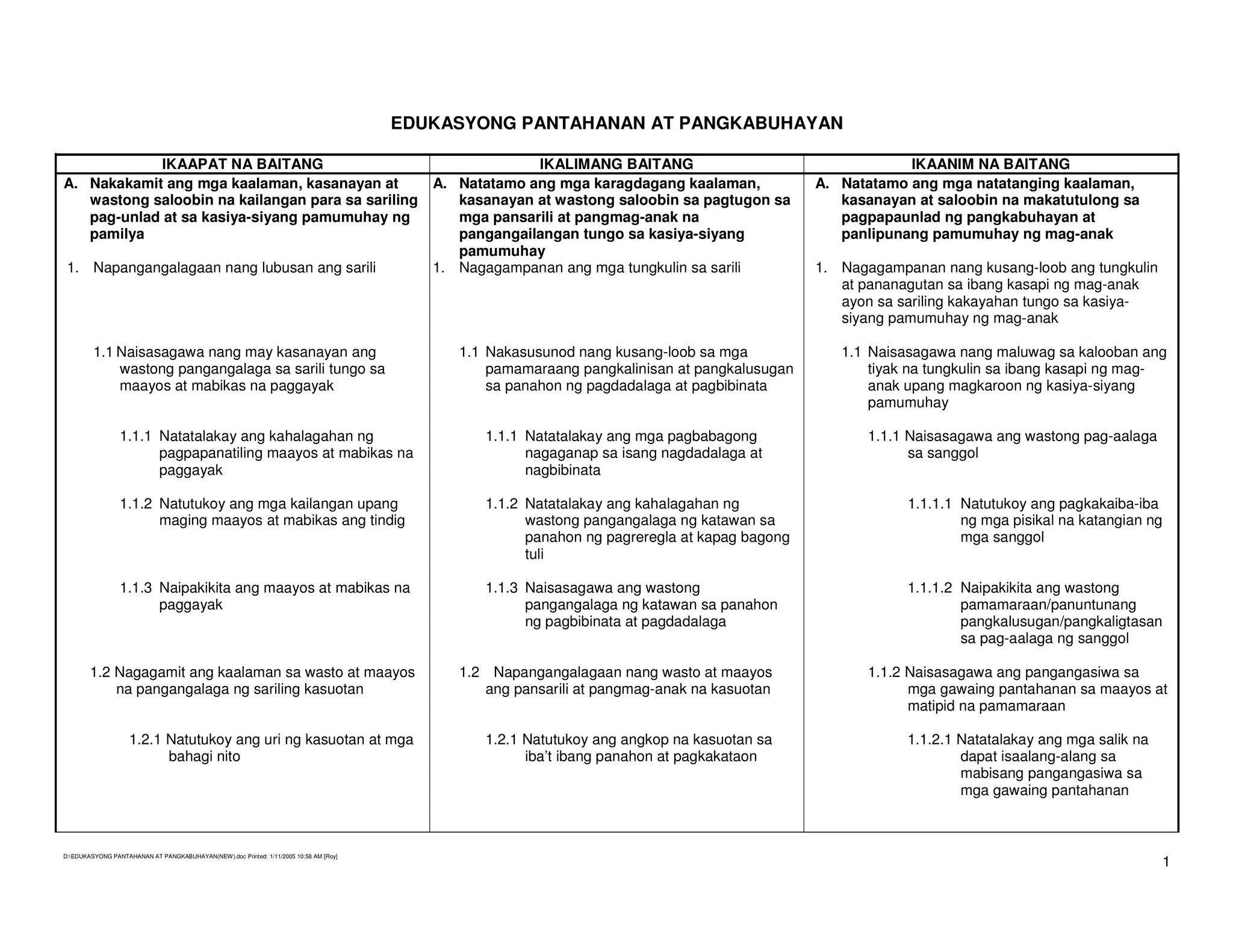 Ang dokumento ay naglalahad ng mga kasanayan at kaalaman na dapat makamit ng mga mag-aaral sa ikaapat, ikalima, at ikaanim na baitang sa larangan ng edukasyong pantahanan at pangkabuhayan. Tinutukoy nito ang mga layunin sa pagkakaroon ng wastong pampamilya, pangkalinisan, at pangangalaga sa sarili, gayundin ang mga kailangan sa pamamahala ng kasuotan at kagamitan. Ilan sa mga pangunahing paksa ay ang tamang pamamahala sa pagkain, paglilinis ng tahanan, at mga simpleng proyekto sa paggawa at pananahi.
