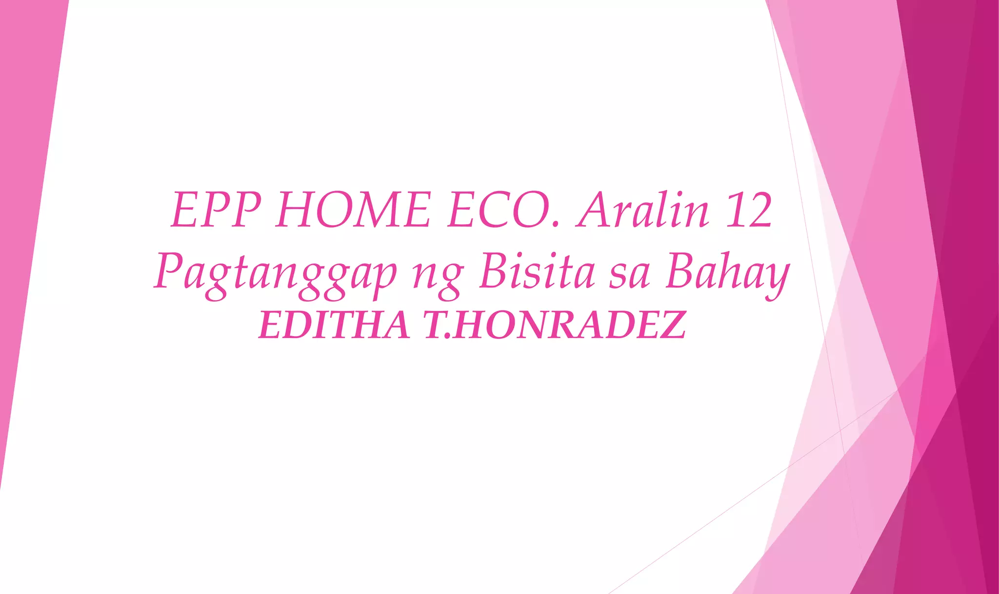 Ang dokumento ay naglalahad ng tamang pamamaraan ng pagtanggap ng bisita sa tahanan, mula sa mga kamag-anak hanggang sa mga hindi kakilala. Binibigyang-diin nito ang kahalagahan ng pagiging magalang, maingat, at masigasig sa pagtanggap, pati na rin ang mga karaniwang kaugalian na dapat sundin. Ang mga bata ay hinihimok na matutunan ang wastong asal sa pagtanggap ng bisita bilang bahagi ng kulturang Pilipino.