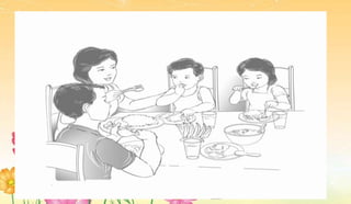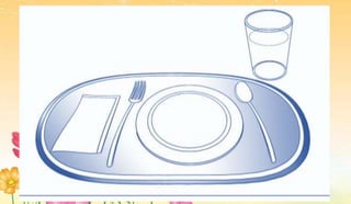 Ang dokumento ay naglalahad ng wastong paggamit ng kubyertos at mga hakbang sa pag-aayos ng hapag-kainan. Tinutukoy nito ang tamang posisyon ng mga kagamitan, mga panuntunan sa kagandahang-asal habang kumakain, at mga angkop na asal sa hapag-kainan. Mahalaga ang sabay-sabay na pagkain ng pamilya upang pagyamanin ang masayang tagpo.