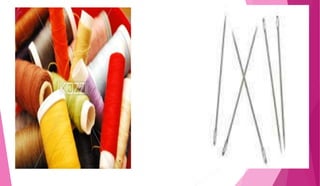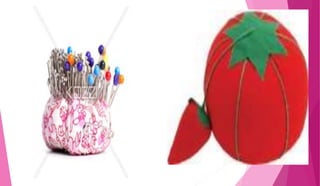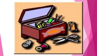 Ang dokumentong ito ay tungkol sa mga kagamitan sa pananahi, kabilang ang medida, gunting, karayom, sinulid, didal, pin cushion, at emery bag. Tinutukoy nito ang tamang paggamit at mga hakbang sa pagtatahi ng damit, pati na rin ang mga ugali na dapat taglayin ng isang Pilipino sa proseso. Naglalaman din ito ng mga pagsusulit upang masuri ang kaalaman ng mga mag-aaral tungkol sa mga kagamitan.