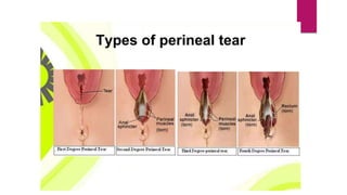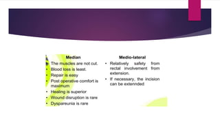 Episiotomy is a surgical incision made in the perineum during childbirth to enlarge the vaginal opening and facilitate delivery. It was once routinely performed but evidence showed it increased risks like severe tearing and pelvic floor dysfunction. Now it is only recommended in targeted cases like instrumental deliveries or to prevent serious maternal lacerations, as determined by the obstetrician. When done, mediolateral episiotomy is preferred and involves local anesthesia and incising the skin, muscles and vaginal wall. Proper repair in layers and post-operative care can help prevent complications like infection, hematoma or incontinence.