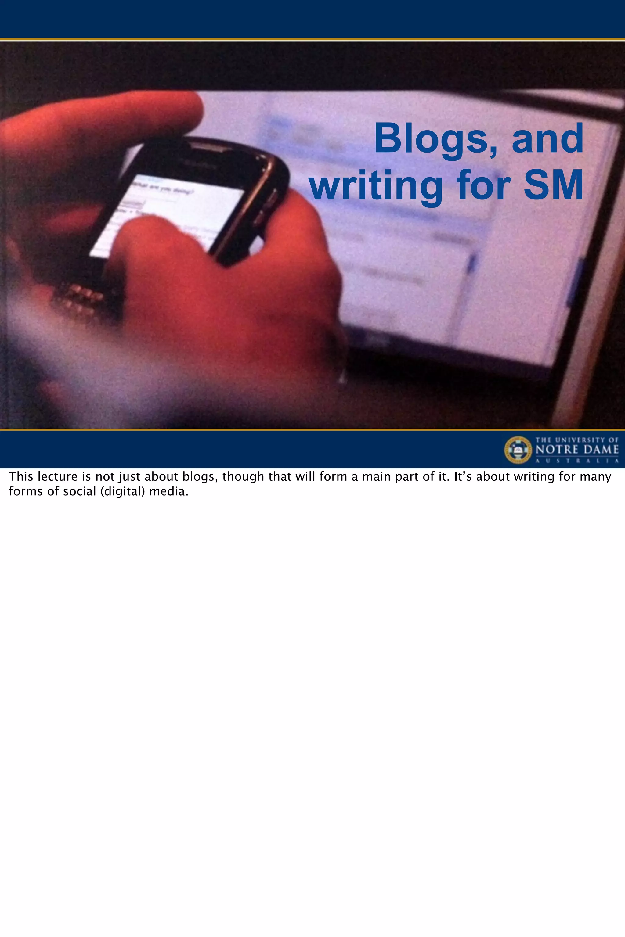 The document discusses the significance and evolution of blogs as a pivotal form of social media communication, highlighting their role in public relations, skills development, and networking. It outlines the history of blogging, the current state of the blogosphere, and best practices for creating effective blogs, emphasizing the necessity for consistency, engaging content, and ethical considerations. Additionally, it explores how businesses leverage blogs for marketing and brand advocacy, outlining effective strategies for outreach and community building.
