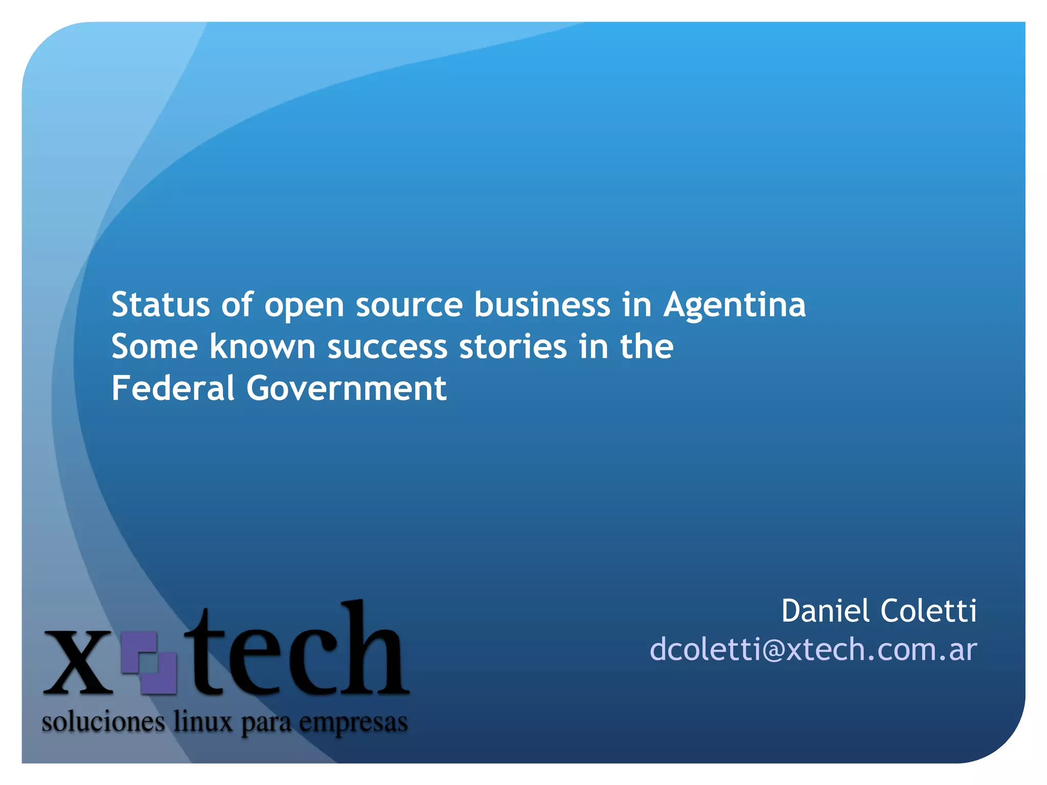 The document discusses the growing success of open source software in the Argentinian federal government. It notes that the 2001 economic crisis proved that open source software is reliable, cheaper, and can help avoid costly software upgrades. The government is increasingly adopting open source strategies, either following Brazil's model of prioritizing domestic open source software or simply using open source solutions while remaining neutral. Several agencies such as the national tax administration, highway administration, and social security agency have implemented open source software successfully.