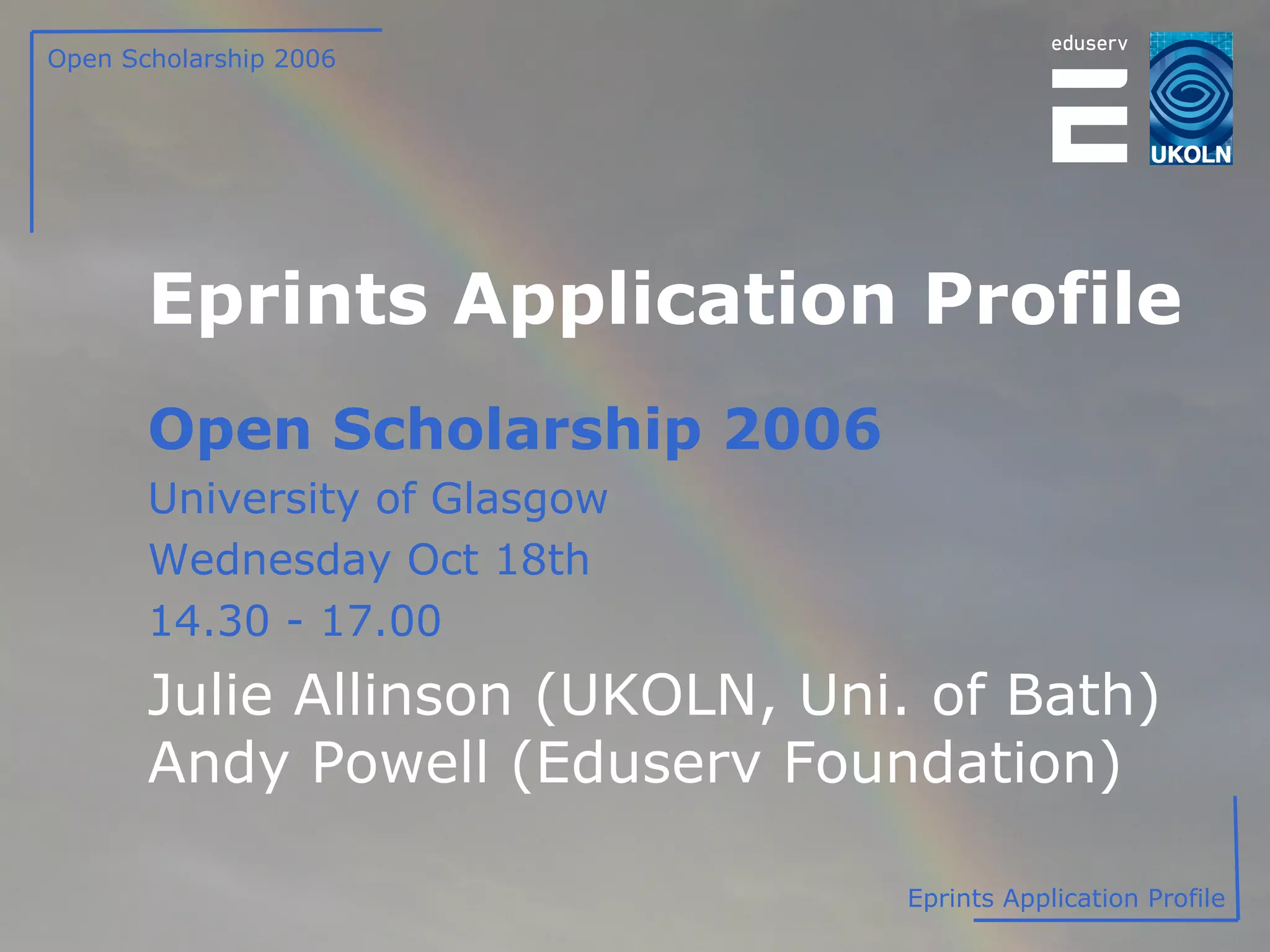 Eprints Application ProfileOpen Scholarship 2006 University of Glasgow Wednesday Oct 18th 14.30 - 17.00 Julie Allinson (UKOLN, Uni. of Bath) Andy Powell (Eduserv Foundation) Open Scholarship 2006 Eprints Application Profile